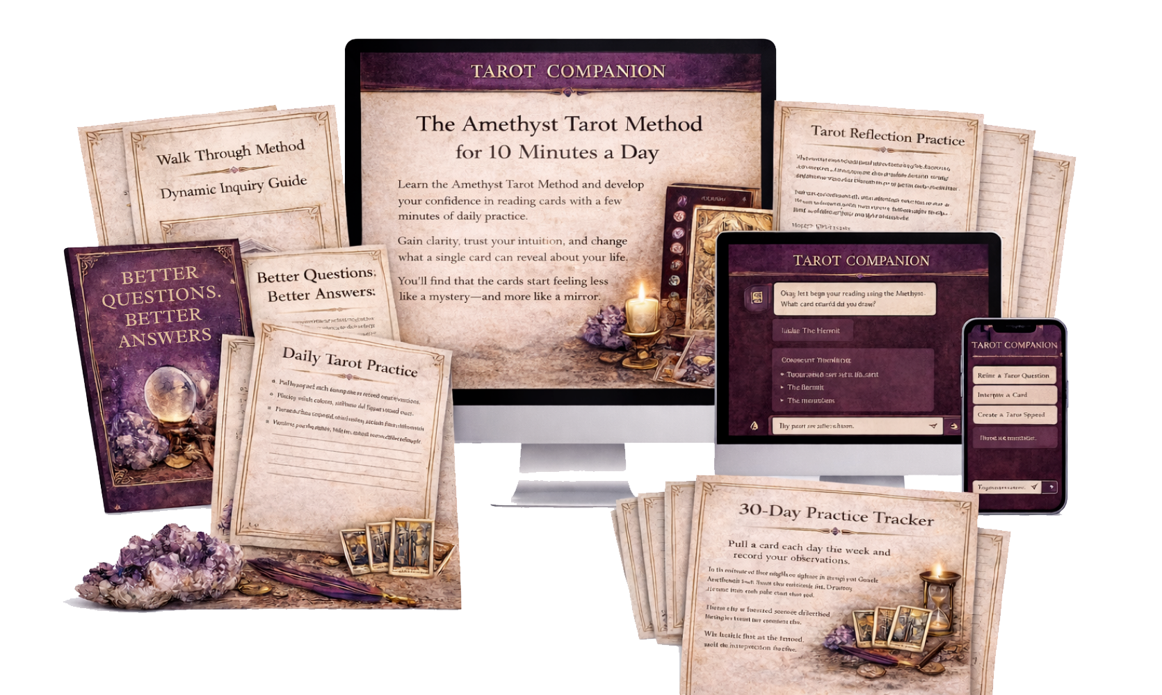 Inside the course, you’ll find the full framework of the Amethyst Tarot Method, along with the companion guides and exercises designed to help you practice the process.